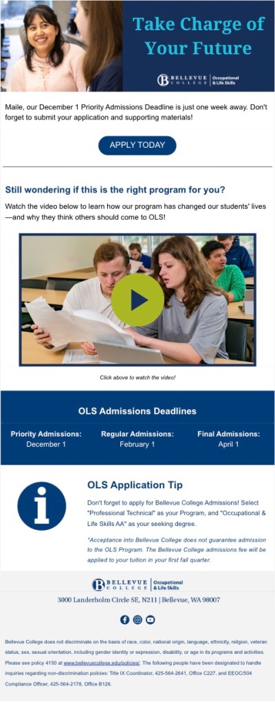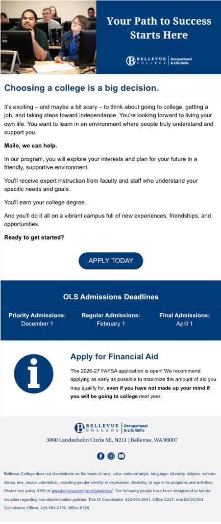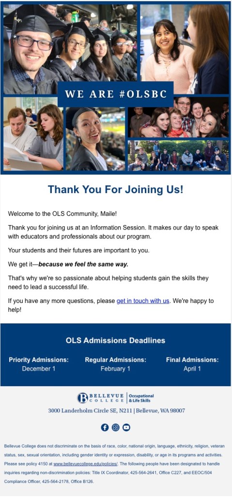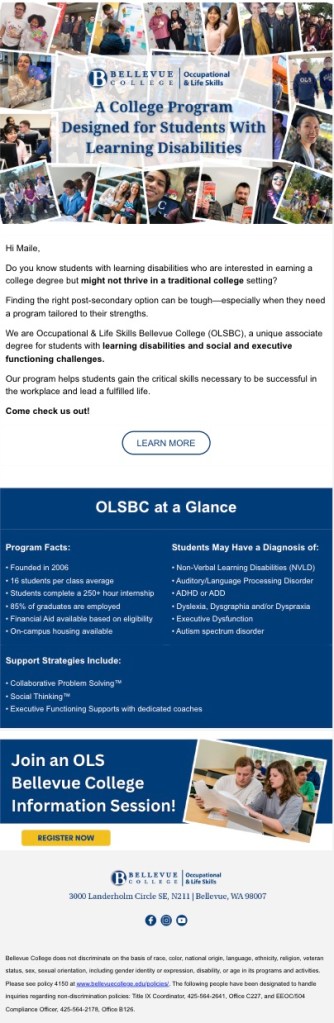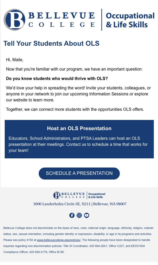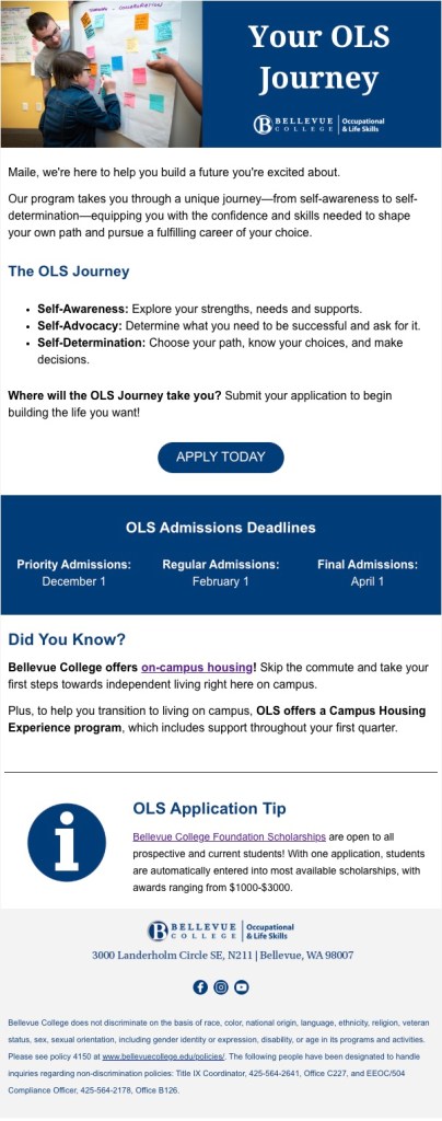In September 2017, I was hired as the Marketing Specialist for the Occupational & Life Skills (OLS) program at Bellevue College, a small (but mighty!), self-sustained associate degree program for students with learning disabilities. As the only marketing-dedicated staff member on the OLS team, I oversee every facet of our marketing efforts including: