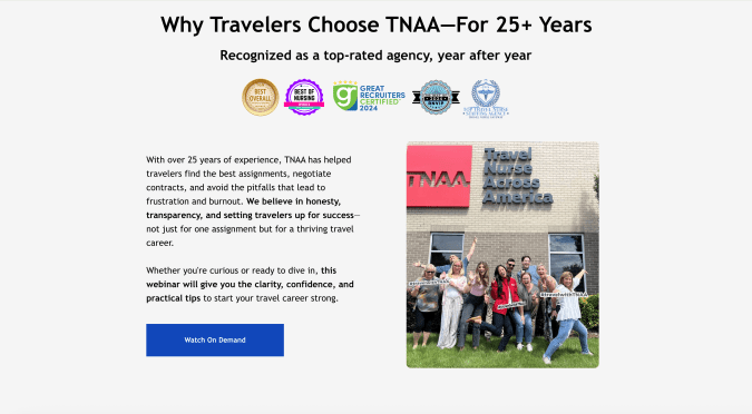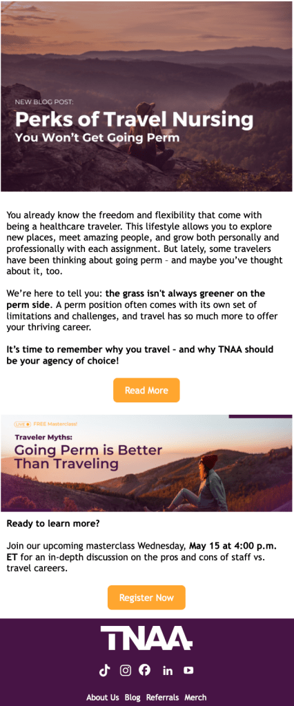 TNAA is a national travel healthcare staffing company. While initially hired as a freelancer in August 2022, writing occasional blogs, my role expanded from June 2023 to October 2025.